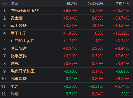 油气开采及服务、贵金属和军工。